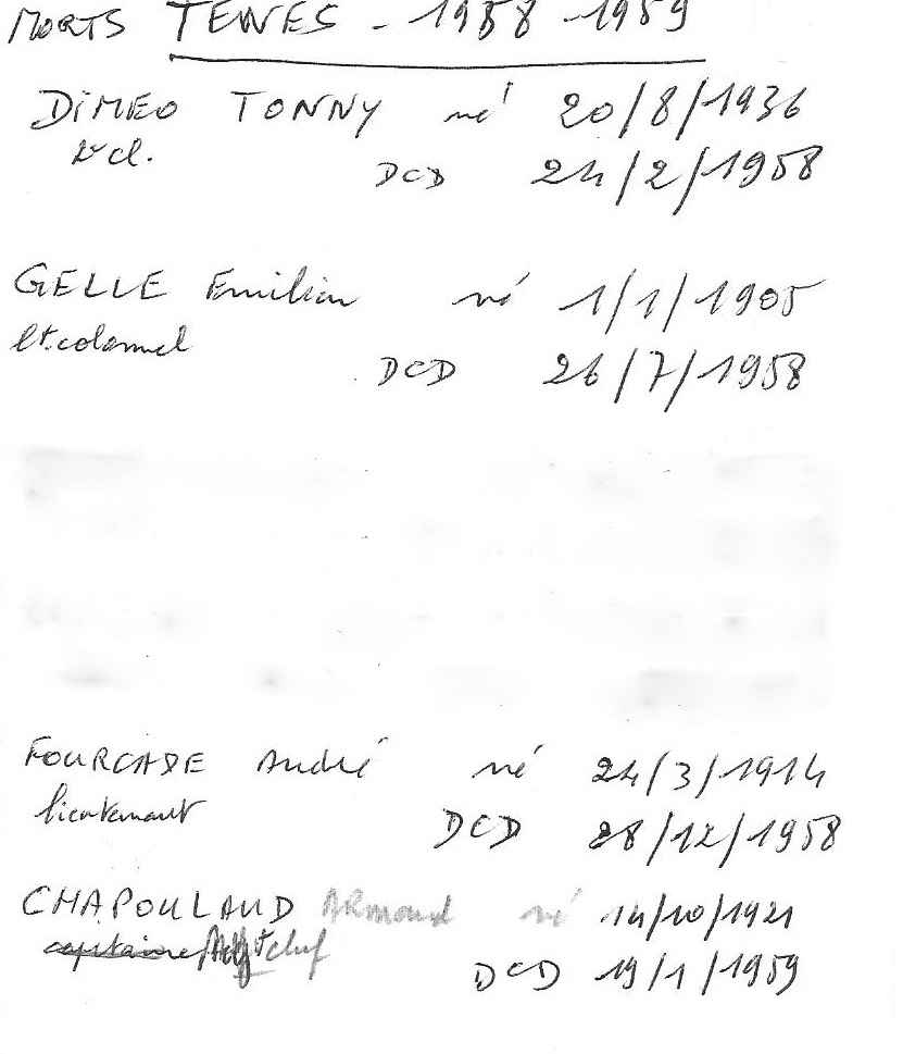 document de Guy PONS liste de ses copains d'unité tués au combat ---- Tony DIMEO Emilien GELLE André FOURCADE Armand CHAPOULAUD